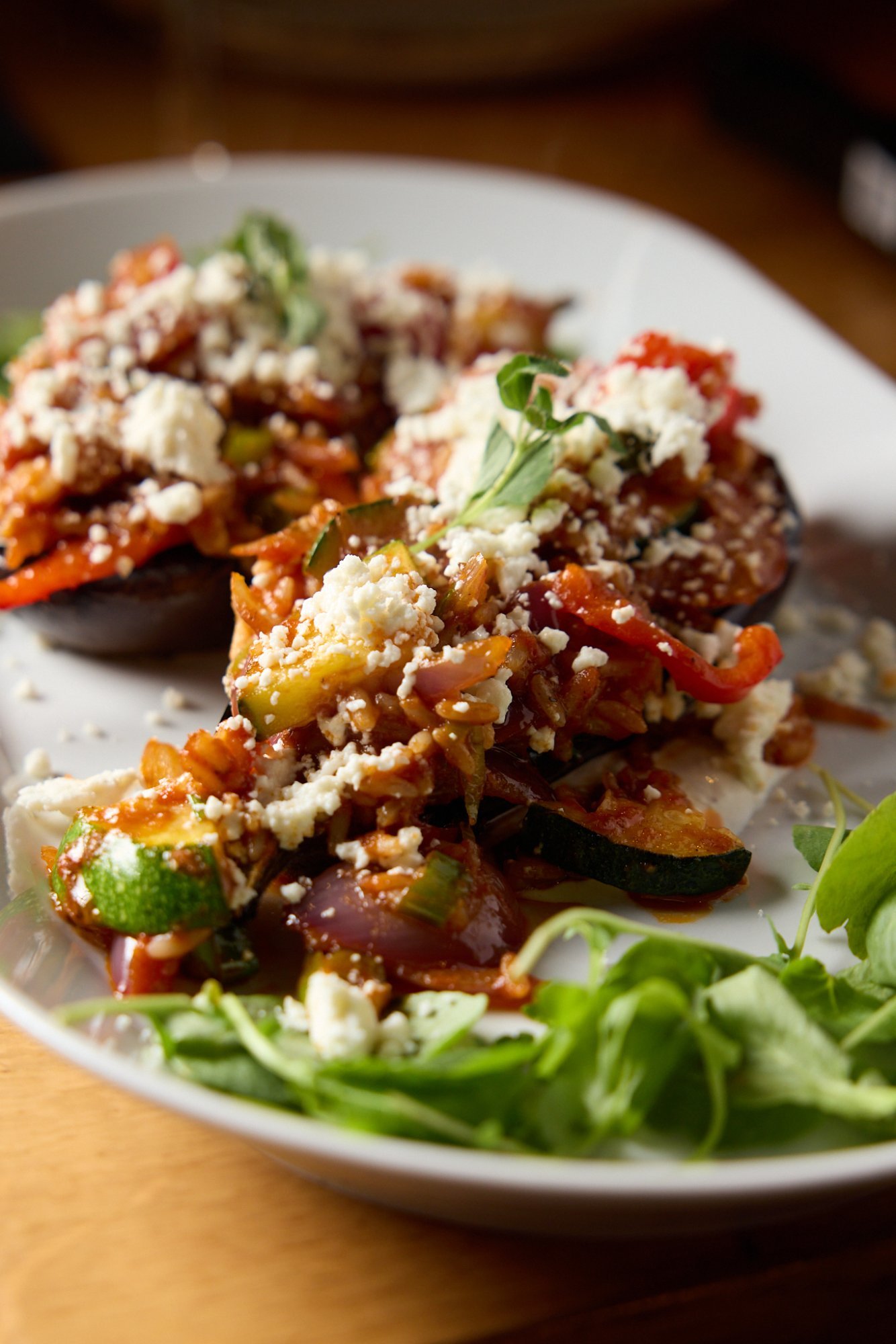 Gegrilde aubergine met een vulling van rijst, paprika, ui, tomaat, courgette en peterselie met een crumble van fetakaas (Veggie)/ Vegan zonder Feta |